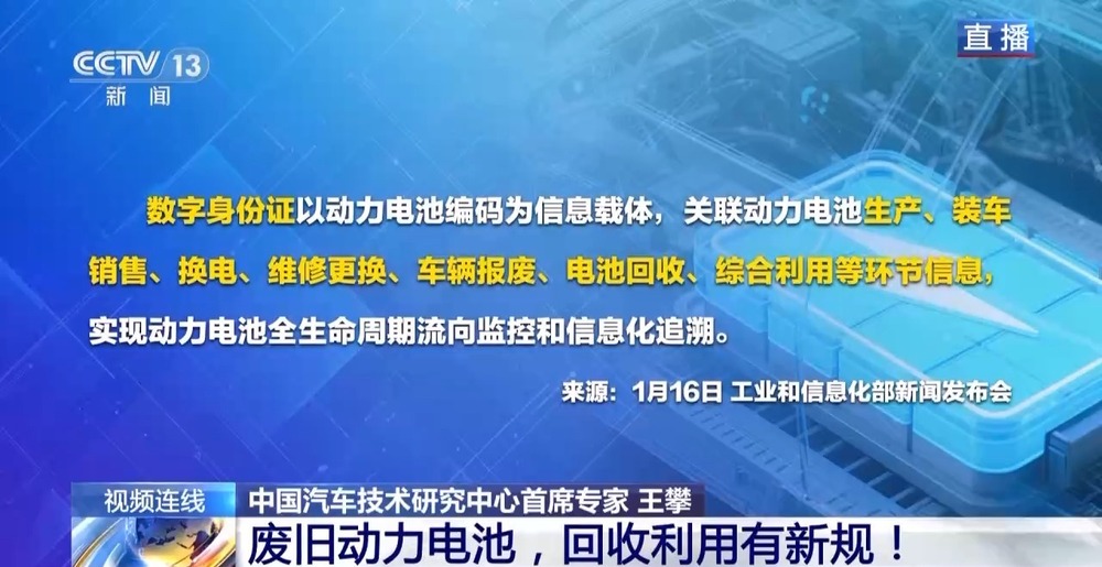 工业和消息化部节能与归纳欺骗司司长 王鹏:实在来说,数字身份证以动力电池编码为消息载体,合系动力电池分娩、装车贩卖、换电、维修更调、车辆报废、电池接受、归纳欺骗等合头消息,达成动力电池全性命周期流向监控和消息化追溯。可能说,将数字工夫运用于动力电池全流程溯源束缚是《束缚设施》的一项要紧轨制革新。