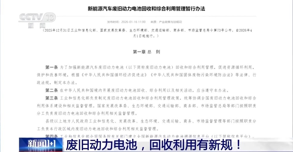 1月16日,一份由工信部等6部分团结宣告的《新能源汽车废旧动力电池接受和归纳欺骗束缚暂行设施》出台。《束缚设施》超过“全渠道、全链条、全性命周期”三大特质。